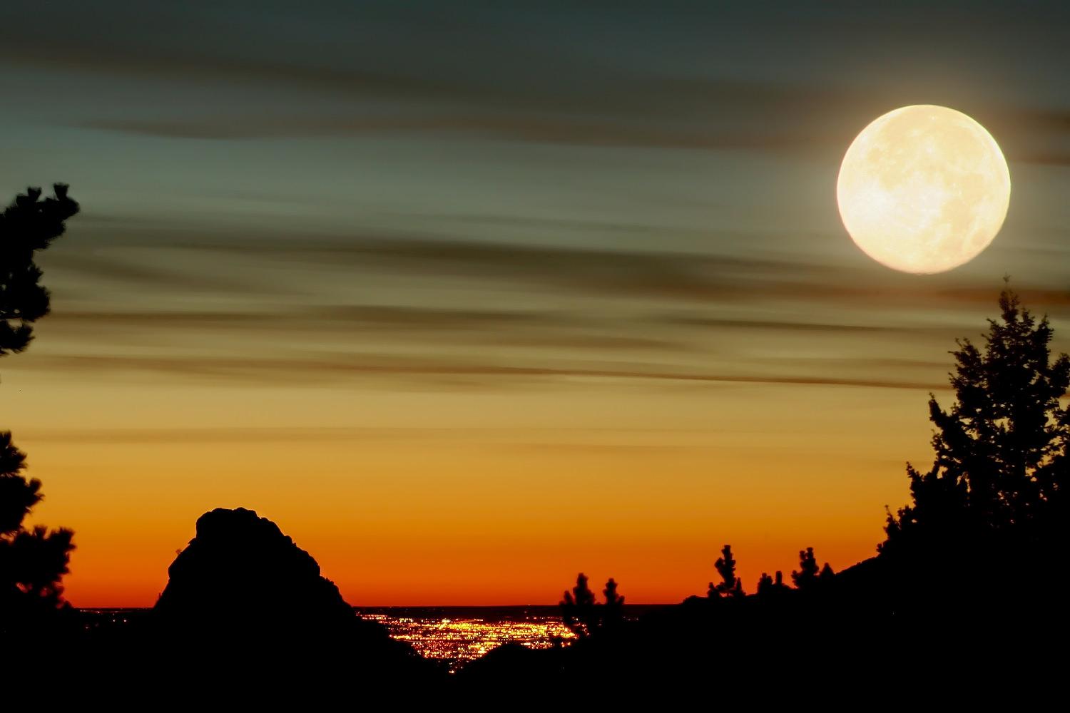 The drawback to this technique is that it's often impossible to have both the moon and the scenery well exposed. If in doubt, underexpose - it's better to have a darker foreground than an overexposed Moon. Alternatively, you can take 2 shots - one exposed for the Moon and one for the surroundings - and then combine them later in Photoshop.